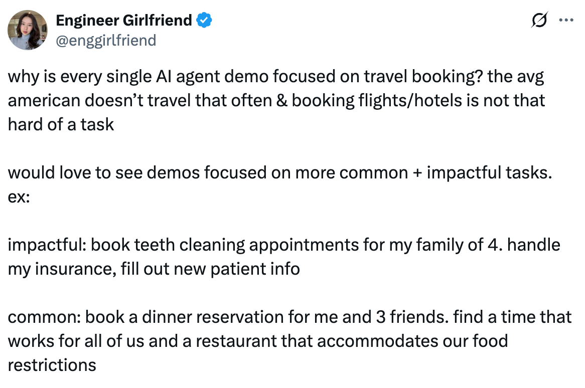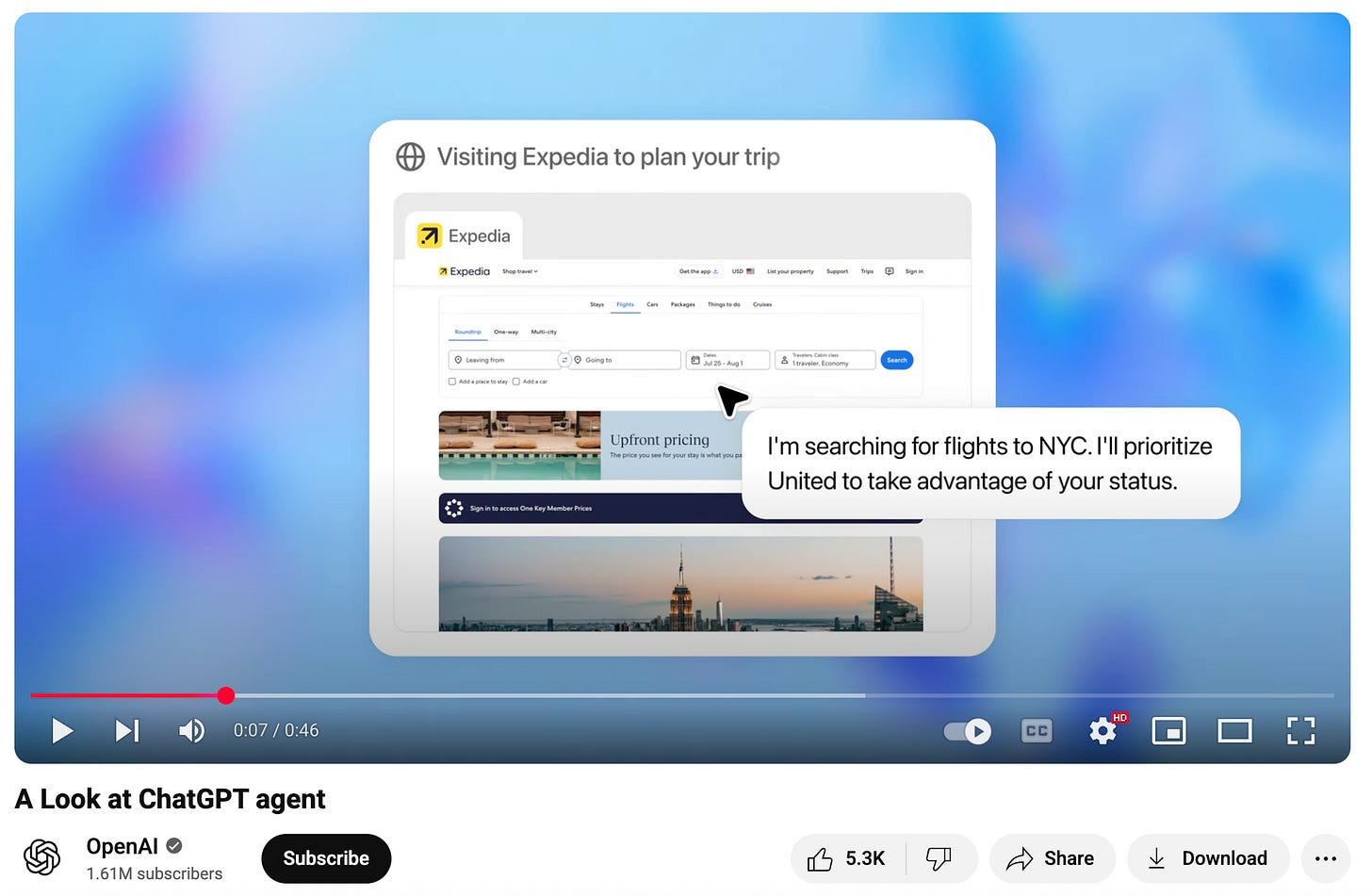 Back to where we started: OpenAI’s agent can now book travel using a web-browser and Expedia. Perplexity has a formal travel vertical. Though delayed, Google (Gemini) Trip Planner is leveraging flights, maps, and gmail data to automate trips. Anthropic’s agent “mimics a travel agent.” LLMs have been using travel ad nauseam, to the point of sparking public complaints.
