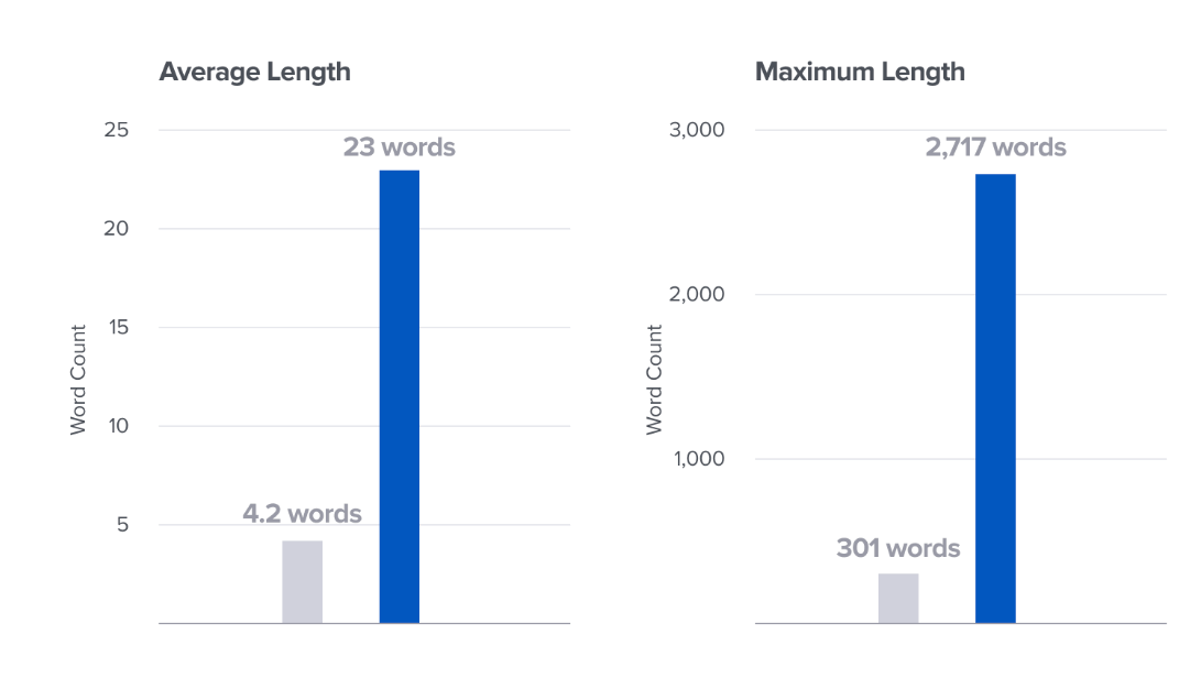 Queries are longer (23 words, on average, vs. 4), sessions are deeper (averaging 6 minutes), and responses vary by context and source.