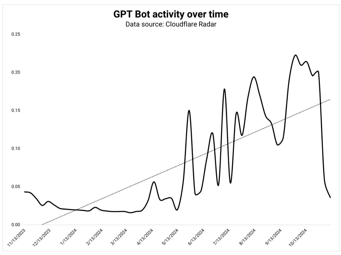 Data from Cloudflare, a cloud service that makes websites load faster and stay safe by filtering traffic through its global network, suggests that these bot activities aren’t just from traditional web-crawlers, but driven by surge of LLM bots both for information gathering and agentic search, with at least two implications: