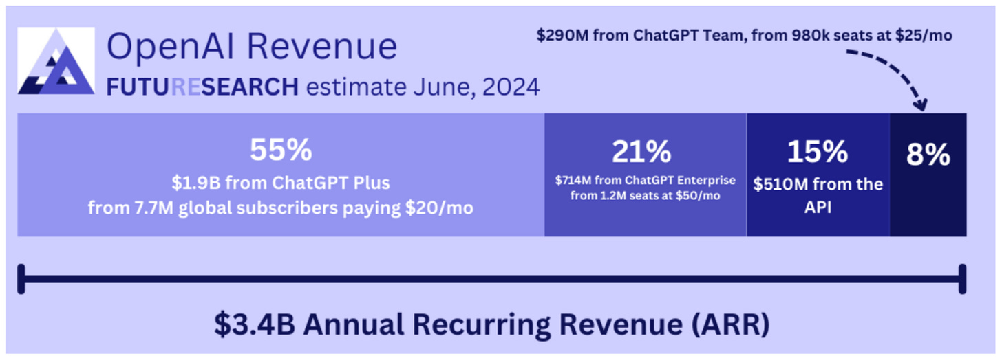 OpenAI recently hit $10B in ARR up from $5.5B last year. Though the split is older, over the CFO noted 75% of that revenue came from paying consumers (i.e. chatbot, and not the API) product.