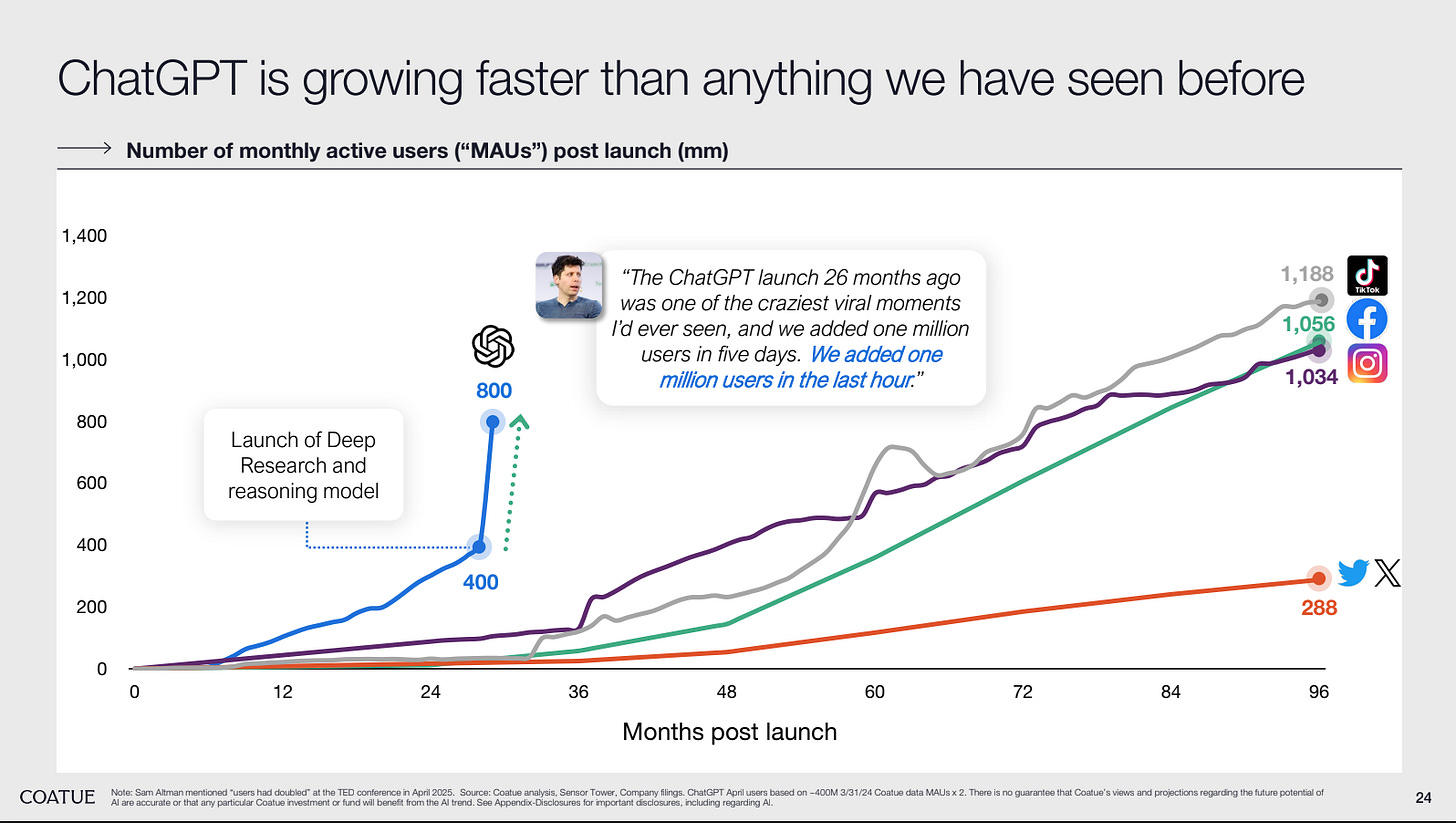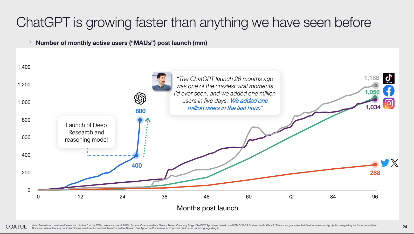 OpenAI is growing faster than any player they’ve seen, according to Coatue, a respected public-private fund with $70B AUM, in Coatue View on the State of the Markets.